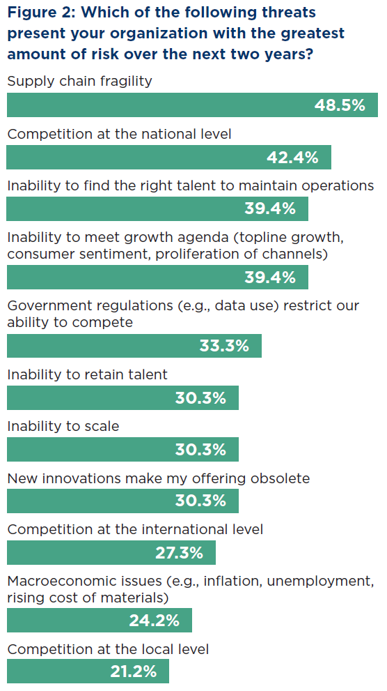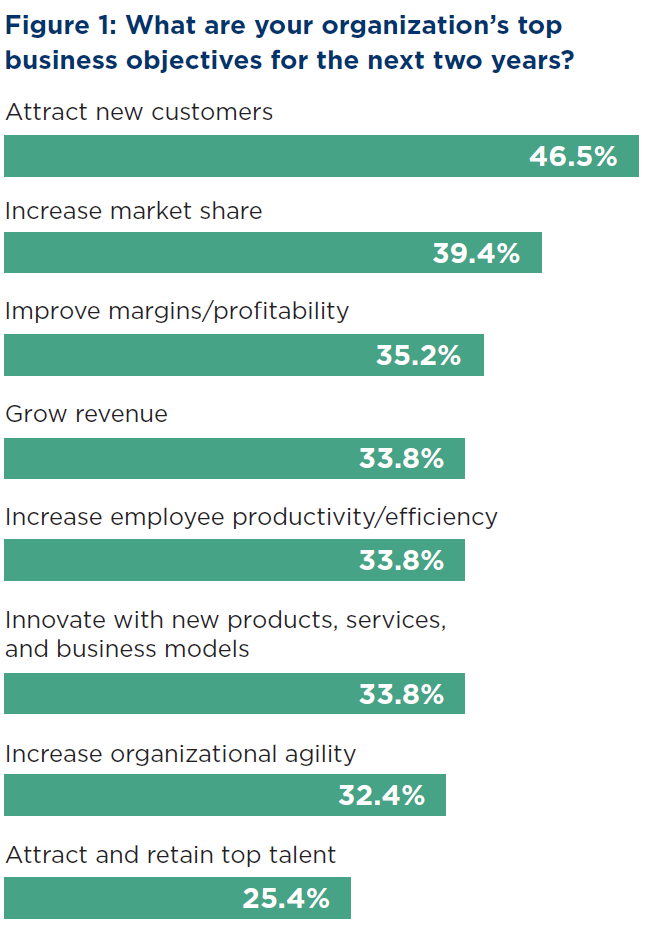 Across professional services, attracting new customers is the standout objective (46.5%), followed by improving market share (39.4%) and margins/profitability (35.2%). Revenue growth also remains a priority (33.8%), while improving productivity/efficiency (33.8%) and agility (32.4%) reflects the pressure to respond faster with fewer bottlenecks. The biggest barrier is not demand—it is scalability: 63% of sales-minded executives cite an inability to scale IT processes and systems as a major constraint, and 42% say difficulty adapting to new information and shifting priorities limits scale. Sustainable growth will depend on consistent tracking, management, and measurement of client engagements from inception through completion.
