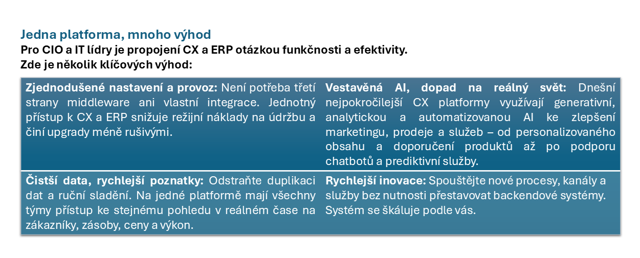Zákaznická zkušenost nemůže fungovat na izolovaných platformách. Pokud jsou nástroje pro práci se zákazníky odděleny od klíčových systémů, týmy ztrácejí čas sjednocováním dat, personalizace se stává nejednotnou a každá změna zvyšuje riziko integrace. SAP ve svém dokumentu „Získejte dlouhodobou loajalitu propojením CX a ERP“ tvrdí, že sjednocení CX a ERP poskytuje IT jednotný základ pro poskytování lepší obchodní podpory – a zároveň snižuje složitost a zrychluje návratnost investic. Odkazuje také na nezávislý výzkum, který ukazuje, že sjednocení CX a ERP může přinést návratnost investic až 726 % díky vyšší produktivitě, zefektivněným procesům a zvýšeným výnosům.