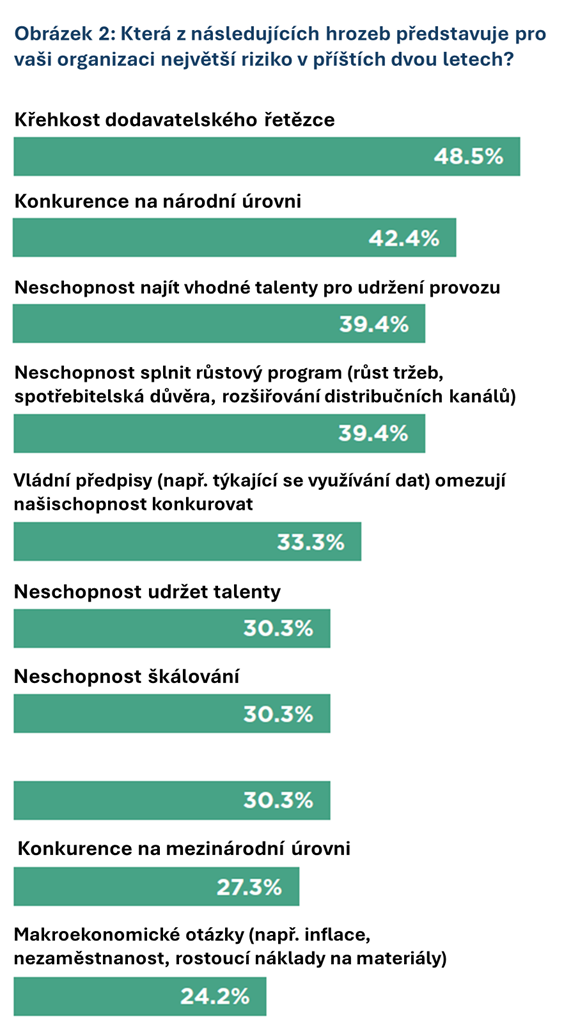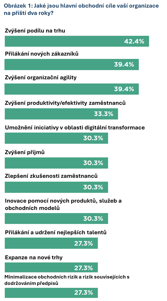 Nejčastěji je jako cíl pro následující dva roky uváděno zvyšování tržního podílu (42 %), těsně následované získáváním nových zákazníků a zvyšováním agility (obojí 39 %). Současně je jako hlavní obava zmiňována křehkost dodavatelských řetězců (49 %) a konkurenční tlak spojený s expanzí, zejména konkurence na národní úrovni (42 %). V důsledku tohoto mixu je vytvářena nová prodejní realita: prodej již není definován pouze produktem a cenou, ale také spolehlivostí, rychlostí reakce a důvěrou. Firmy, u nichž je dostupnost, závazky dodání a hodnotová diferenciace komunikována jasně, jsou zvýhodňovány vyšší úspěšností i lepší retencí zákazníků.